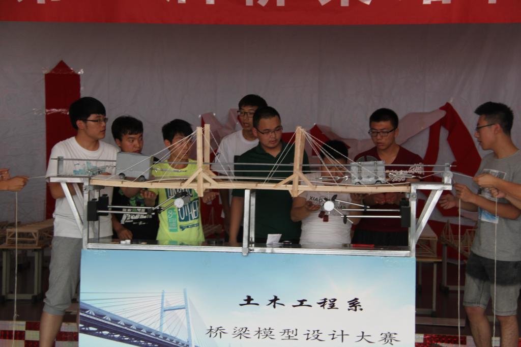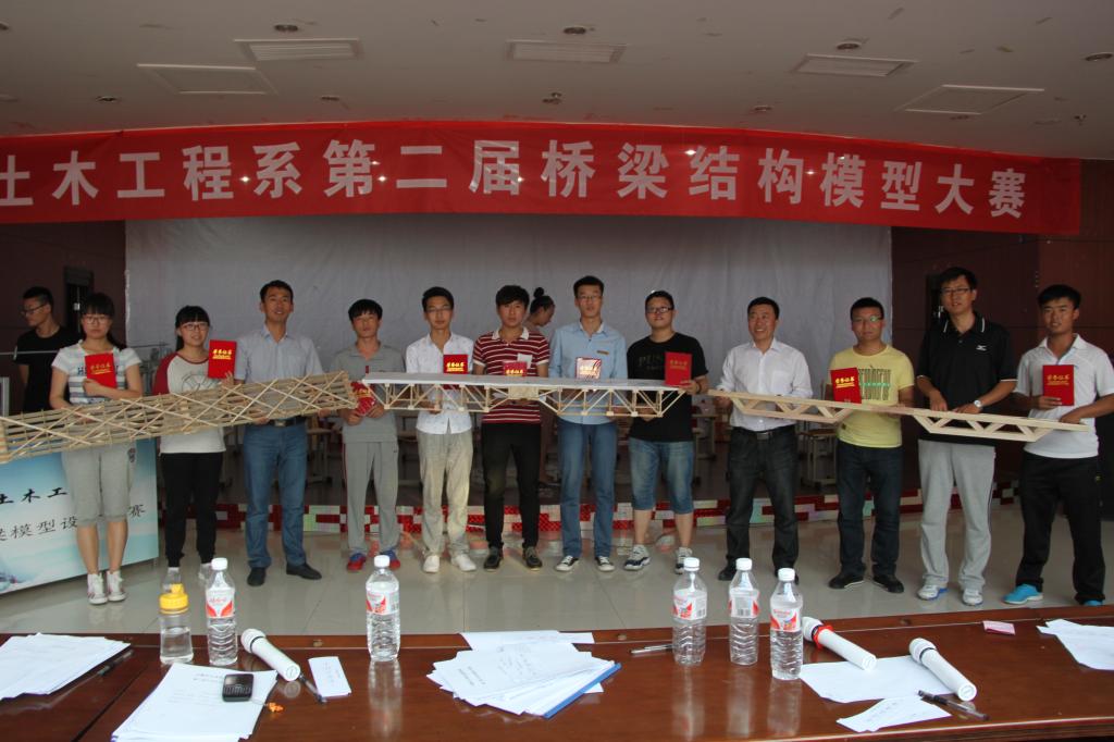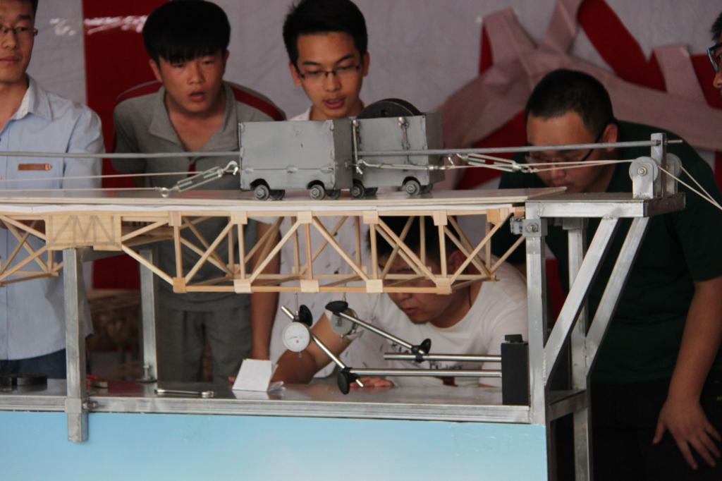 本次桥梁模型结构大赛共有25个参赛组,经初审确定18个组参加最终决赛。比赛分为四个环节,分别为桥梁测重,跨中加载500g,双车道小车偏载以及单车道偏载试验。模型最大挠度、极限载荷、造型以及理论分析是评分主要依据,经过三个半小时的比拼,刘贝等人组的“缘聚桥”获得一等奖;奇雨欣等人组的“筑梦队”、韩建国等人组的“金洲大桥”、牛得水等人组的“鄂尔多斯六号桥”获得二等奖;孙乐等人组的“擎天311”、李天亮等人组的“长风”、邵丹丹等人组的“辽河大桥”、李文鹏等人组的“简约之美”、益拉古其等人组的“蒙汉大桥”获得三等奖;王建伟等人组的“上承式桁架拱桥”获得最佳造型奖。