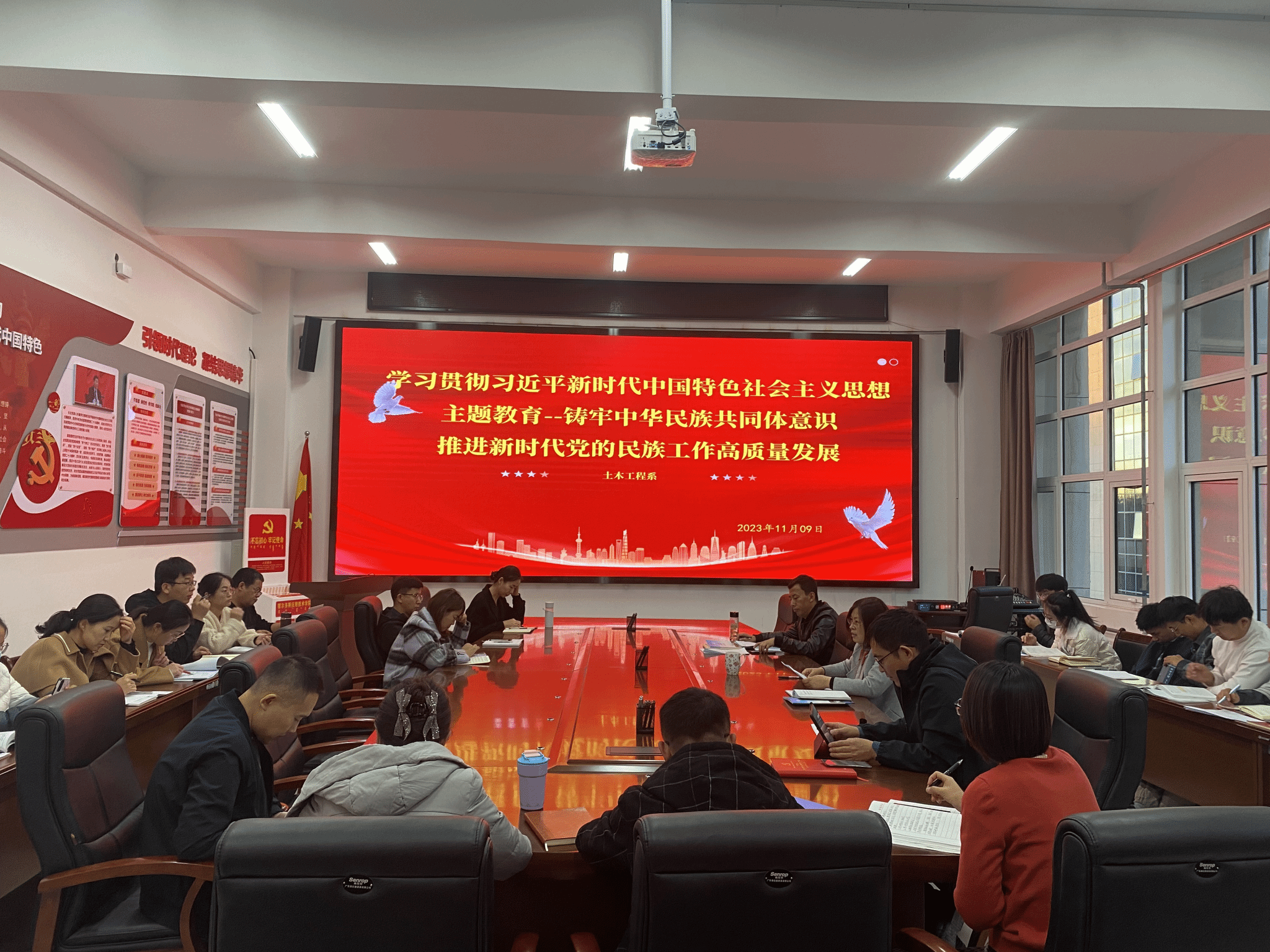 2023年11月9日下午,土木工程系党总支开展了“铸牢中华民族共同体意识 推进新时代党的民族工作高质量发展”为主题的主题教育学习活动。该活动分为观看习近平总书记在中共中央政治局第九次集体学习时的讲话精神视频和学习研讨交流两个环节进行,系部全体教职工参加了此次学习活动。
