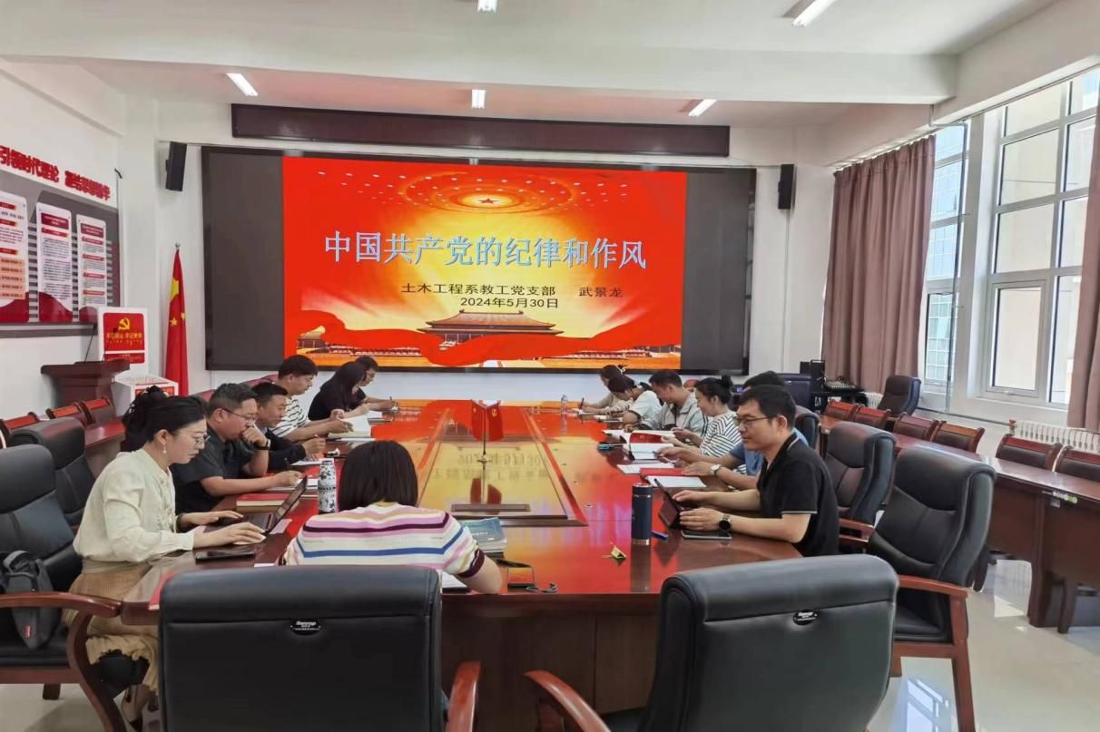 为深入开展党纪学习教育,强化党员纪律意识,将党纪学习教育融入日常,引导全体党员进一步学纪、知纪、明纪、守纪,强化遵守纪律的自觉。5月30日下午,土木工程系党总支副书记武景龙为教工支部全体教师党员讲授党纪学习教育专题党课。