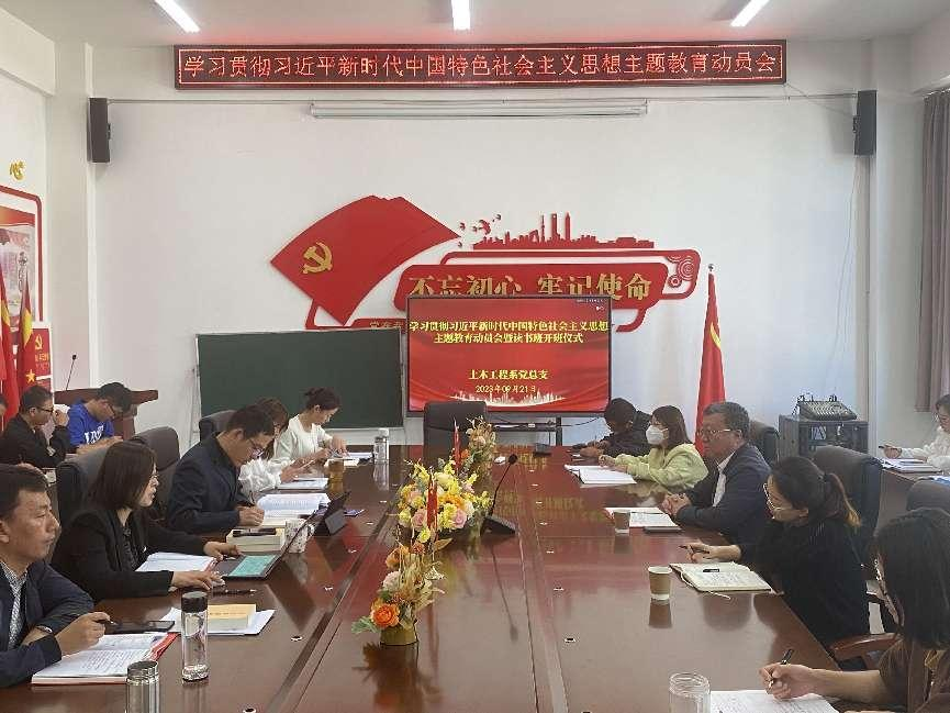 2023年9月21日下午,土木工程系党总支组织全体教师召开学习贯彻习近平新时代中国特色社会主义思想主题教育动员会暨读书班开班仪式,系党总支副书记武景龙向全体教师宣达了自治区、公司党委的指示精神精神、深刻领悟主题教育的重大意义。