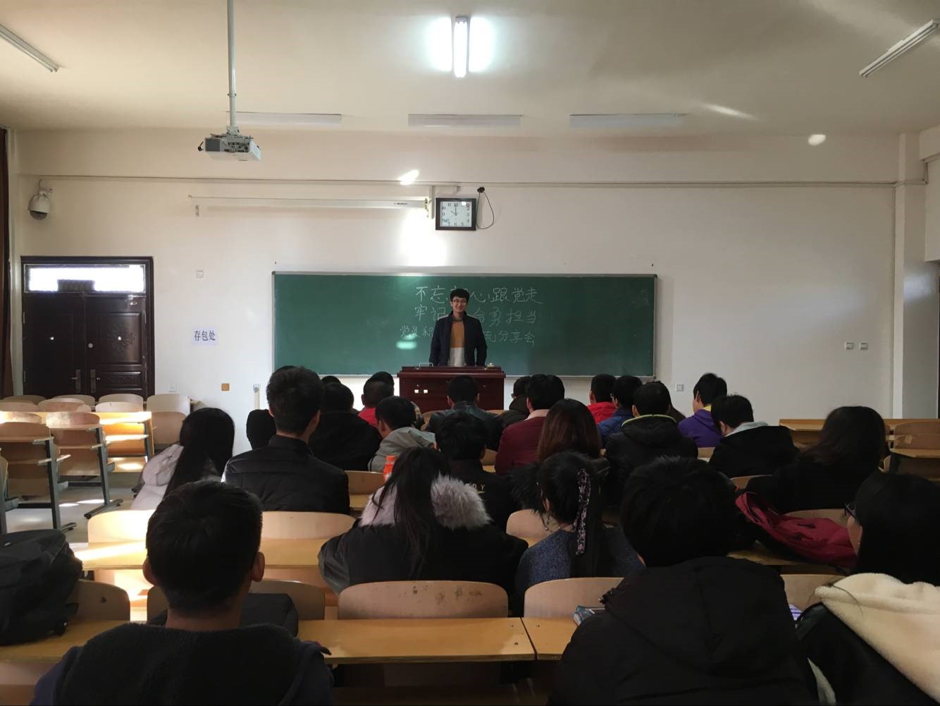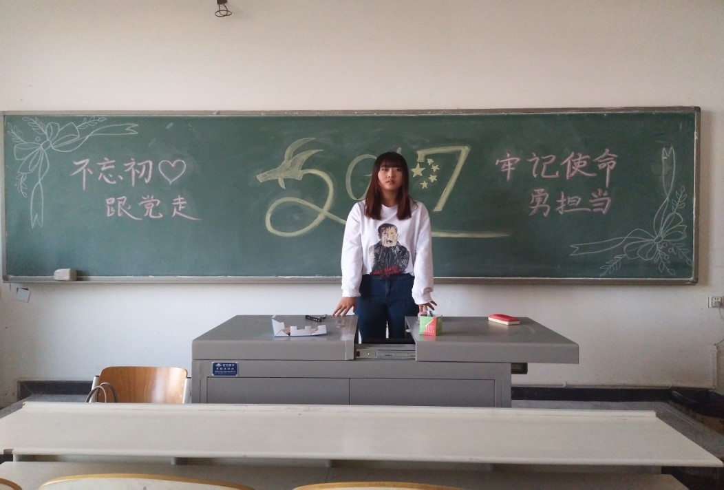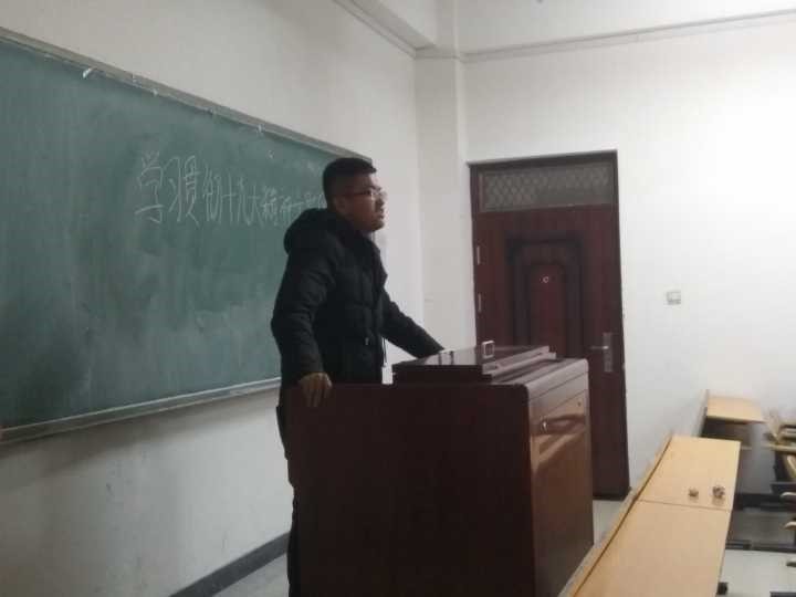 16级土木二班团支书先是从党的十九大报告的主要内容及深远影响两个方面进行了阐述,目的是为了让同学们更深层次的认识党,靠近党,紧随党,在意志和精神上支持党。阐述结束后,又由班里的几位积极分子及重点培养对象依次发言,他们深入的分析融汇了自己对十九大的感受,让在座的同学们更加清晰的认知到了“不忘初心跟党走,牢记使命勇担当”这句话的内在含义。