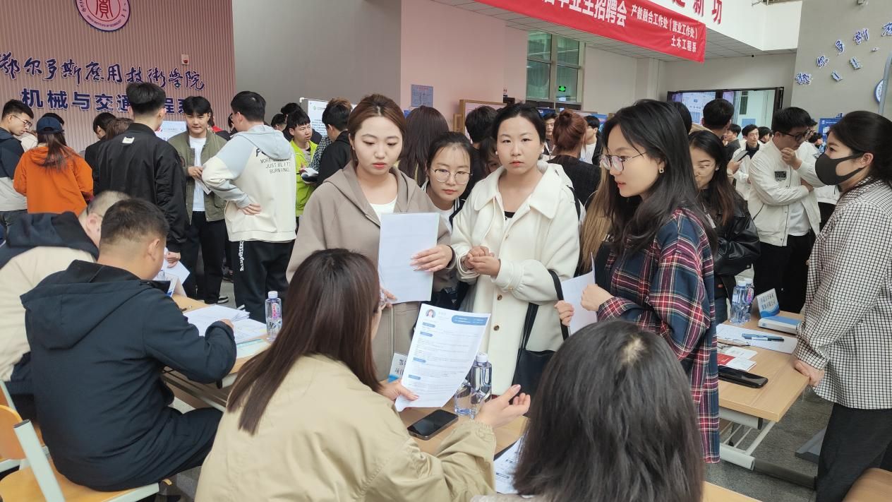 招聘会现场秩序井然,土木工程系应届毕业生带着简历踊跃前往各个招聘点,积极主动与招聘企业进行沟通交流,各企业通过海报、发放传单、讲解等形式,将公司情况、招聘岗位、相关福利与工作环境等信息给应聘员工做了详细解读。