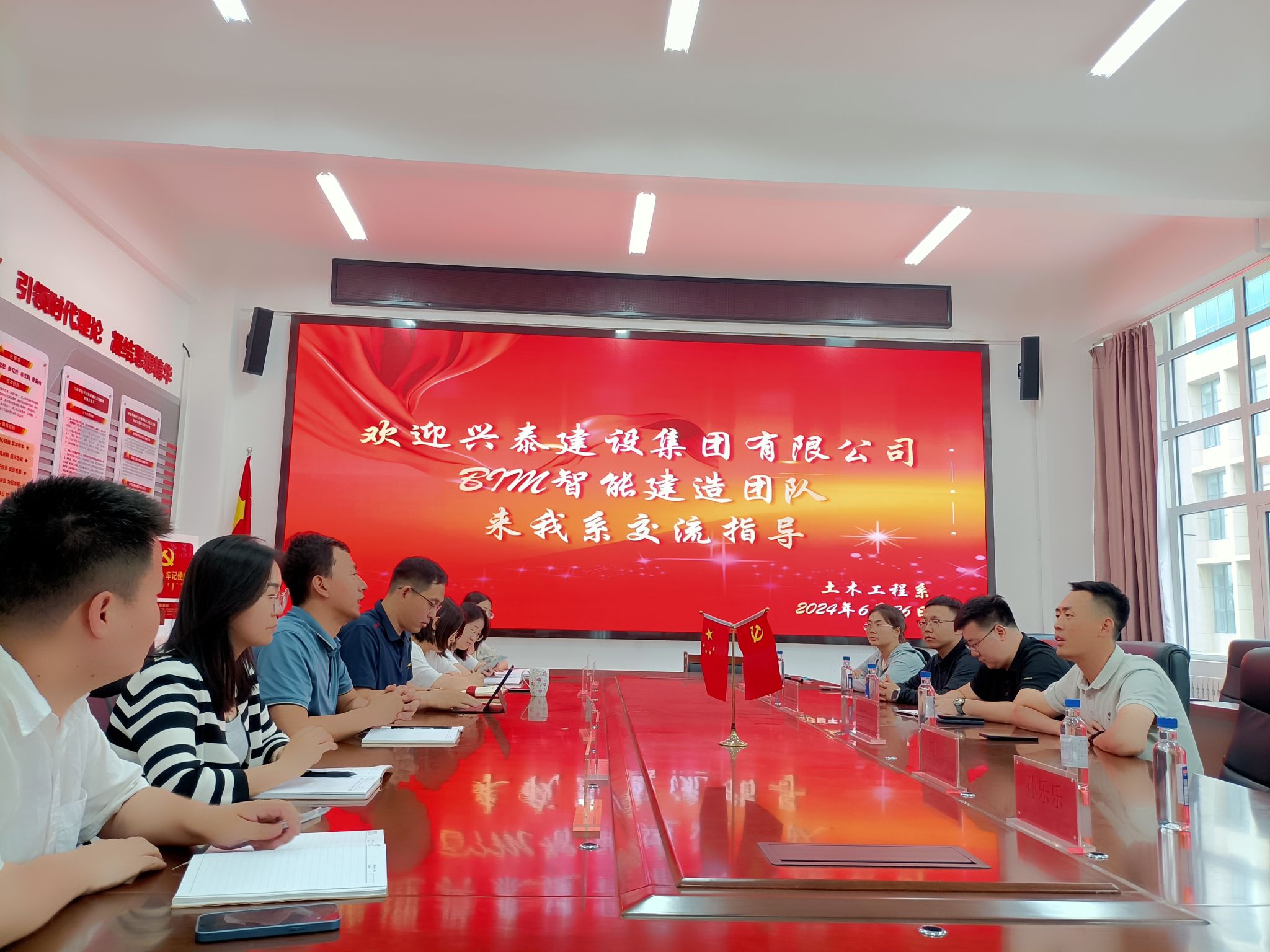 2024年6月26日,兴泰建设集团有限公司BIM中心主任李晓龙一行到我系就双方校企合作以及BIM智能建造相关工作进行交流指导,我系副书记武景龙、副主任商艳、副主任许波、工程造价教研室负责人杜娟以及骨干教师若干参加交流会。