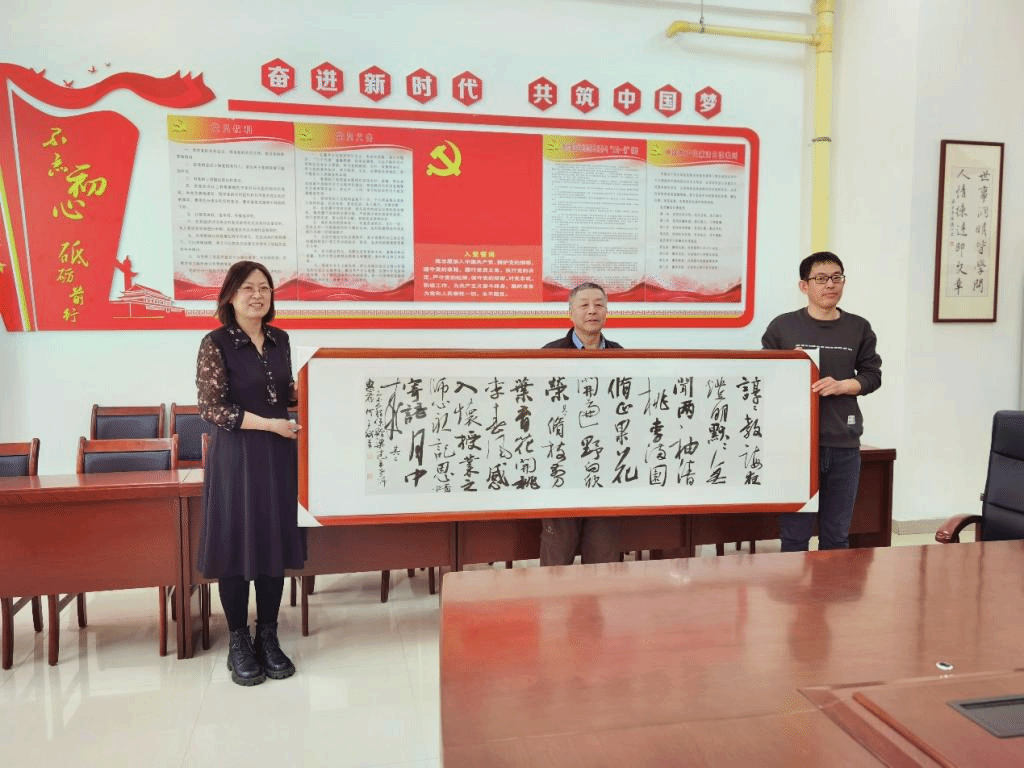 最后,土木工程系向梁建平教授赠与书法,书法由公司统战部部长何子斌书写,寓意梁教授桃李满天下。会后土木工程系全体教师与梁建平教授进行合影留念。