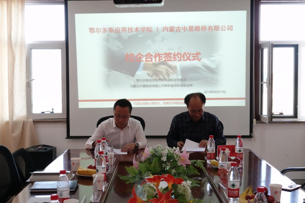 5月17日下午,公司党总支教师在公司副经理张荷亮的的带领下,深入施工企业,与内蒙古中景路桥有限公司党支部开展交流座谈,并签订校企合作协议。