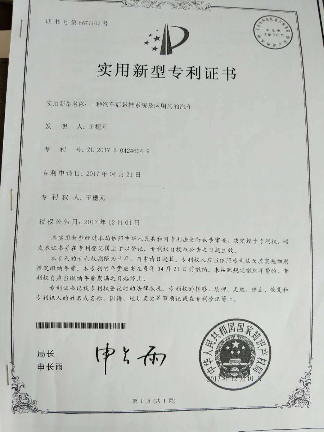 近日,由公司2014级土木工程专业员工王楒元自主研发的实用新型专利《一种汽车后悬挂系统及应用其的汽车》获中华人民共和国国家知识产权局授权,专利号为【ZL201720424634.9】。该项专利于2017年04月21日申报,2017年12月01日正式授权公告。