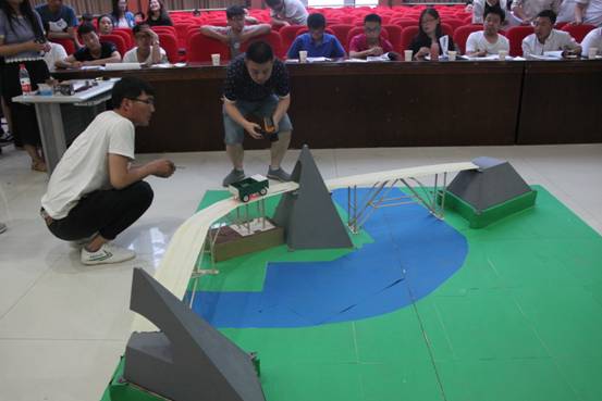 本次大赛的评委有:商艳老师、唐宝利老师、李兴老师。大赛中,首先由选手阐述桥的特点以及设计理念,并且将桥置于已经准备好的模拟软土地基上,进行小车过桥的用时测试;同时评委老师对各组的计算书、设计阐述等进行打分。全部演示结束后,评委老师分别对每组桥的优缺点以及改进方向提出了专业性的建议;随后,根据各组得分排列名次:第一名:第七组;第二名:第五组、第三组;第三名:第六组、第四组、第一组;优秀组:第二组。最后,商老师进行总结发言;唐老师对本次桥梁模型大赛存在的专业性技术问题做出评价。大赛在同学们激烈的探讨声中结束。在大赛的终了,评委老师与获奖选手合影留念。