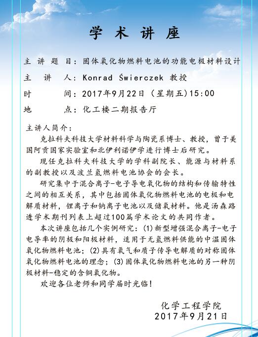 克拉科夫科技大学KonradŚwierczek教授,KonradŚwierczek在位于波兰克拉科夫的克拉科夫科技大学材料科学与陶瓷系获得博士和教授职位。2007-2008年,他在美国阿贡国家实验室和北伊利诺伊大学进行博士后研究。目前,他是克拉科夫科技大学的学科副经理和能源与材料系的副教授。他还是波兰氢和燃料电池协会的会长。他的研究集中于混合离子-电子导电氧化物的结构和传输特性之间的相互关系,其中包括固体氧化物燃料电池的电极和电解质材料,锂离子和钠离子电池以及储氧材料。他是汤森路透学术期刊列表上超过100篇学术论文的共同作者。